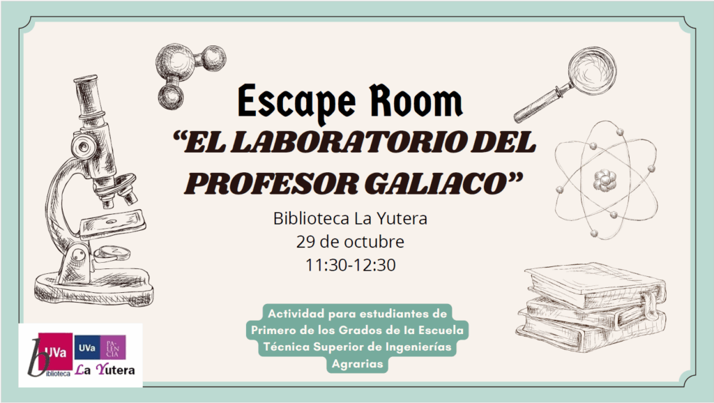 “El laboratorio del profesor Galiaco” es un proyecto de breakout diseñado y llevado a cabo por la Biblioteca del Campus de Palencia, destinado al alumnado del primer curso de los grados de la Escuela Técnica Superior de Ingenierías Agrarias.