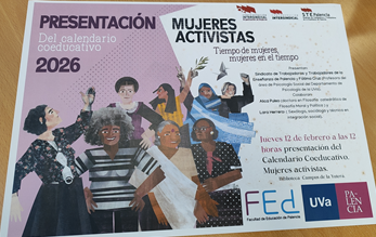 Seguidamente, a las 12:00 h., la presentación del calendario didáctico y coeducativo Tiempo de Mujeres, Mujeres en el Tiempo 2026, este año está dedicado a Mujeres activistas, de la mano del Sindicato de Trabajadores y Trabajadoras de la Enseñanza de Palencia (STE) y la docente de la Facultad de Educación, Fátima Cruz. También, en la presentación se contará con la colaboración de Alicia Puleo y Lara Herrero.